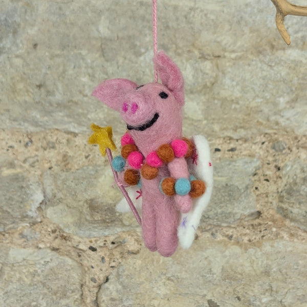 Penelope isn't your average fairy – she's got sass, class, and a whole lot of sparkle! With her blinged-out jewellery that's sure to make even the most fashion-forward fairies jealous, she's ready to hog the spotlight at any gathering. This swinely sorceress has delicate embroidered detailing on her wings, hand-rolled felt balls for her necklaces & bangles and a shining star on top of her adjustable wire wand. With a flick and a swish, Penelope is ready to add some porky pizazz to any Christmas tree!