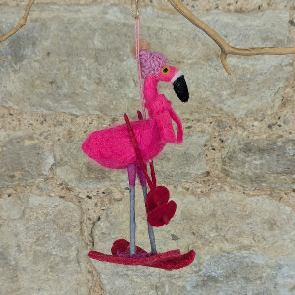 This daredevil is here to prove that flamingos aren't just graceful in water; they can shred the snowy mountains too! Made from fabulous neon pink felt to stand out against the snow (or your Christmas tree) and sporting a lilac knitted hat, standing tall with bendable legs on bright red skis, this flamboyant feathered friend is the epitome of quirky Christmas vibes. Skiing Flamingo has been handcrafted with love and care by a team of talented artisans in Nepal.